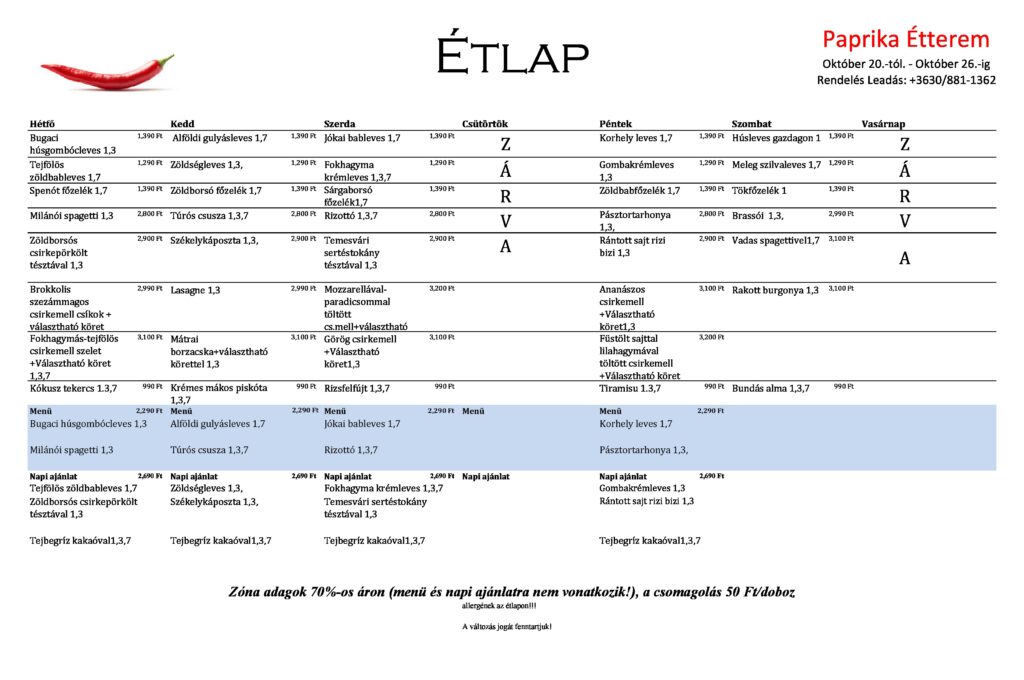 Paprika étterem és kávézóTradicionális magyaros ízekkel és családias hangulattal várjuk vendégeinket. MENÜBugaci húsgombóclevesMilánói spagetti2290 NAPI AJÁNLATTejfölös zöldbablevesZöldborsós csirkepörkölt tésztávalTejbegríz kakaóval2690 FŐZELÉK MENÜTejfölös zöldbablevesSpenótfőzelék1800