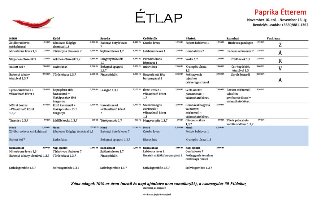 Paprika étterem és kávézóTradicionális magyaros ízekkel és családias hangulattal várjuk vendégeinket. MENÜZöldborsóleves csirkehússalRakott kel2290 NAPI AJÁNLATMinestrone levesBakonyi tokány tésztávalSzilvásgombóc2690 FŐZELÉK MENÜMinestrone levesSárgaborsófőzelék1800