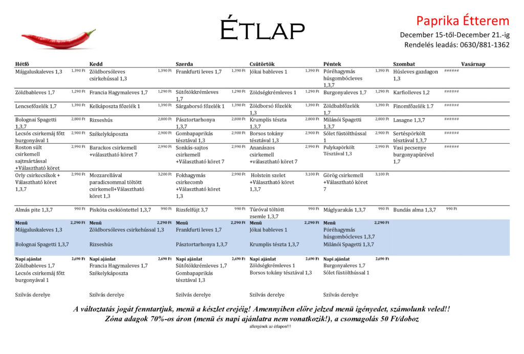 Paprika étterem és kávézóTradicionális magyaros ízekkel és családias hangulattal várjuk vendégeinket. MENÜMájgaluskalevesBolognai spagetti2290 NAPI AJÁNLATZöldbablevesLecsós csirkemáj főtt burgonyávalSzilvás derelye FŐZELÉK MENÜZöldbablevesLencsefőzelék1800